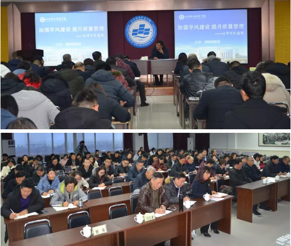12月13日下午,Beat365官网特邀周晓明教授为全体副科以上干部做了“加强学风建设,提升质量管理”的专题讲座。周教授从“自觉树立质量文化意识”“深入推进教学改革,严格教学管理”“加强学风建设”三个方面做了丰富而有针对性的培训。党委副书记、副校长原美荣主持会议并对接下来的学风建设工作提出具体要求。