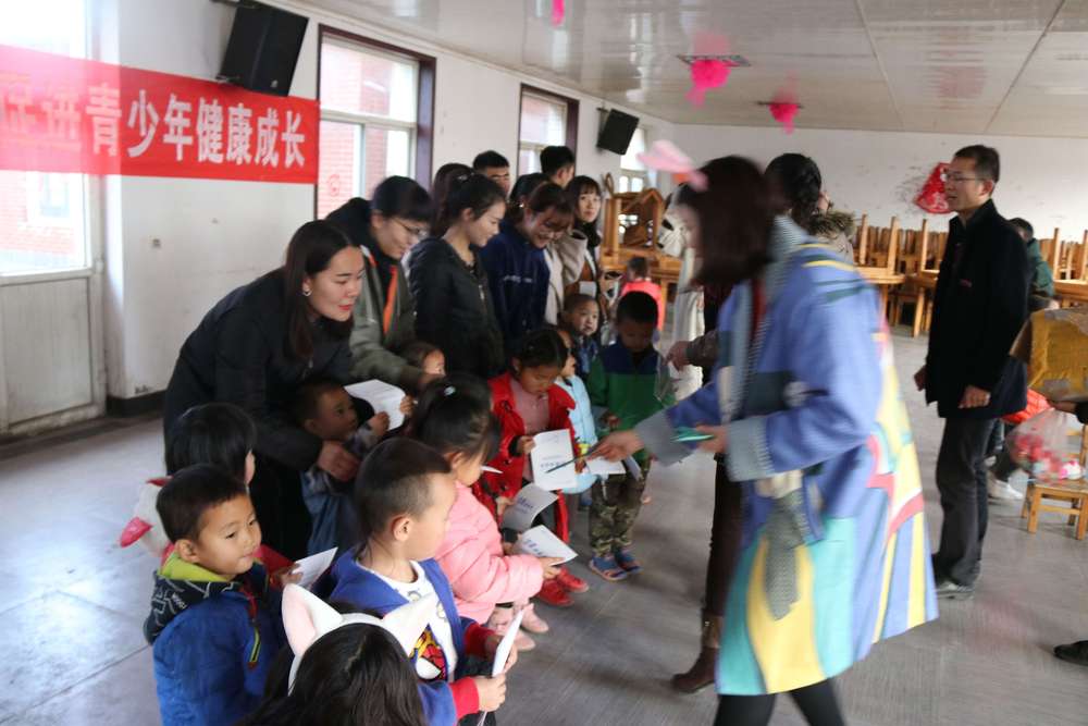 师生们为孩子们分发学习用品