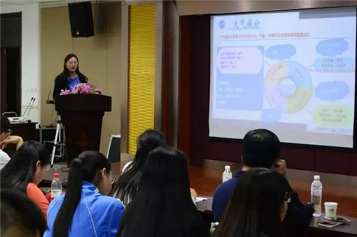 本次讲座分为三部分。第一部分:大气污染的成因及类型;第二部分:臭氧的功过;第三部分:气候变化的事实。王雁老师首先从大气污染的成因及类型入手,向同学们系统介绍了地球大气的演变、生物生存的原因、大气的垂直分层,通过数据说明PM2.5在我们生活中的扮演角色。通过古今对比,她用四幅图说明我国近40年能见度的变化趋势、空气污染变化趋势。王老师明确分析出“雾”与“霾”的区别并说明了大气中存在的其他污染问题。