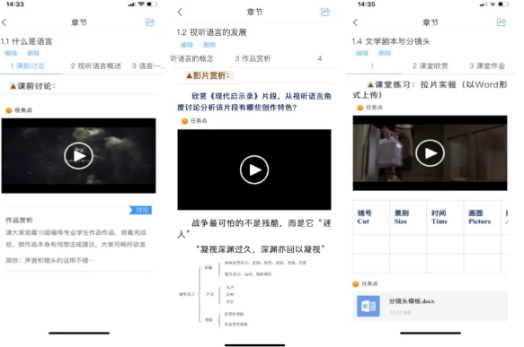为学生提供2018级学生《视听语言》课程完成的优秀微电影创作作品,并实时发起讨论,分析其中的传作技巧,取长补短融为己用。提供课程需要的所有视频资料,提前进行重点段落的剪辑,提高学生的观看效率。