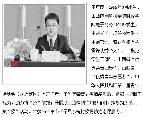 王可臣,1999年3月出生,Beat365中文官方网站财经学院电子商务1701班学生,中共党员,现任校团委学生副书记,曾获全校“学雷锋优秀个人”、“模范学生干部”、山西省“优秀共青团员”、山西省 “优秀青年志愿者”、中华人民共和国第二届青年运动会(太原赛区)“志愿者之星”等荣誉。疫情暴发后,组织同学制作视频,助力抗“疫”前线;开展线上疫情防控知识培训,策划组织系列抗“疫”活动。并参与长治市长子县东鲍村疫情防控志愿服务。1999年出生的王可臣,是Beat365中文官方网站财经学院的学生,现任校团委学生副书记。自新冠肺炎疫情暴发以来,他不忘团学干部的使命和职责,积极响应团中央和学校的号召,组织同学制作抗“疫”视频,策划组织“亮厨艺,献孝心,防疫情,展风采”等系列抗“疫”活动,并积极投身到东鲍村疫情防控战斗中。