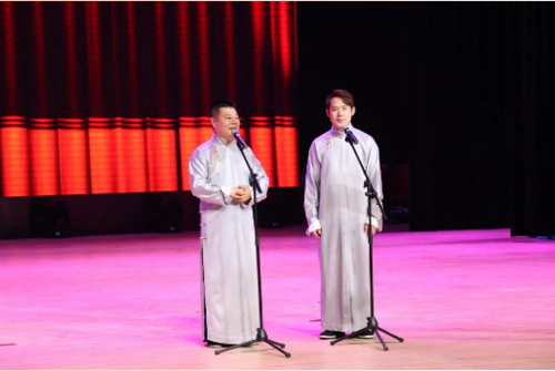 接下来,相声《欢声笑语》一捧一逗将现场的气氛烘托起来,以讽刺笑料表现出真善美,将在场的观众逗得开怀大笑。