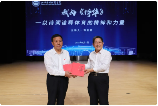 6月1日,省政协常委、教科卫体委员会主任、省体育总会主席苏亚君受邀在艺术大楼大会堂作“我与《诗华》——以诗词诠释体育的精神和力量”专题讲座。校长宋兴航,党委副书记、副校长原美荣,副校长柴跃生、贺有,教务长王林义及全校师生代表聆听了讲座。讲座由校长宋兴航主持。