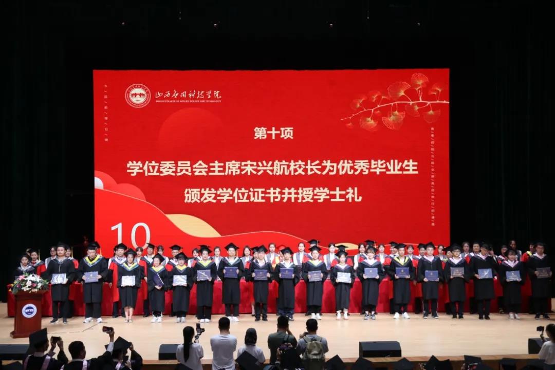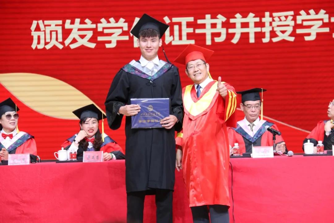 伴随着温情的音乐声,宋兴航校长与其他校领导为获得学士学位的毕业生一一扶正流苏、颁发学位证书,他们与毕业学子深情拥抱,合影留念。