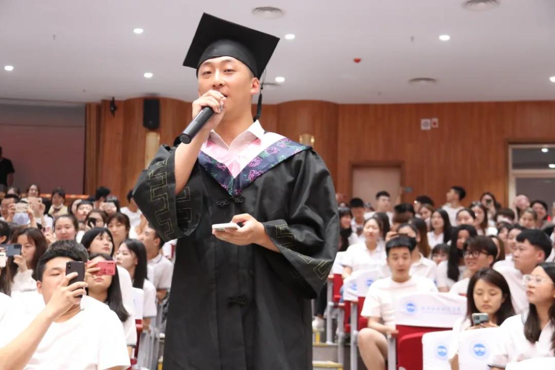 毕业生代表、音乐学院音乐表演专业1701班郑飞伟同学发言。他深情表达了对母校的依恋和怀念,真诚感谢学校、老师的辛勤培育,欣喜见证了科院的一次次发展变化。回顾科院四年的成长和收获,他表示这些将是他人生最重要的财富!离别之际,他代表几千名即将毕业的学子郑重承诺:牢记学校领导、老师们对我们的谆谆教诲与殷切期望;秉承母校“求知 修德 强能 报国”的校训,将宋校长倡导的“三三精神”牢记于心,勇担时代赋予我们的历史使命,把论文写在祖国的大地上,在祖国最需要的地方建功立业,共同演绎新时代中国的美好续集。