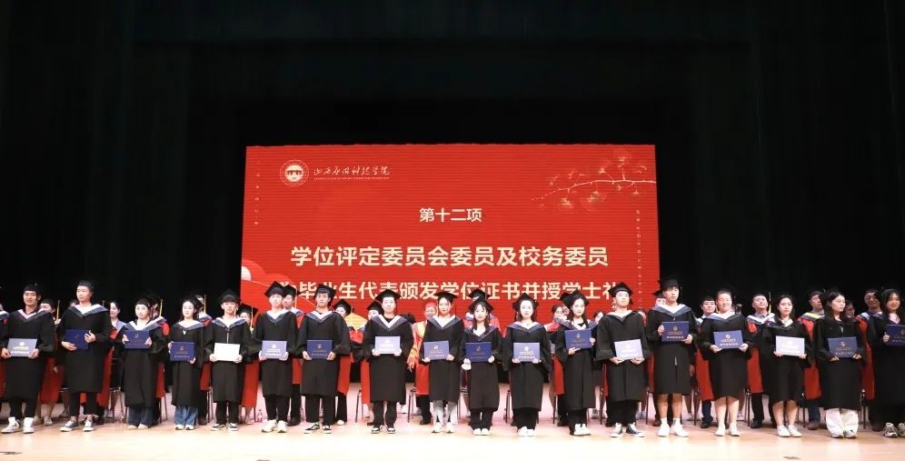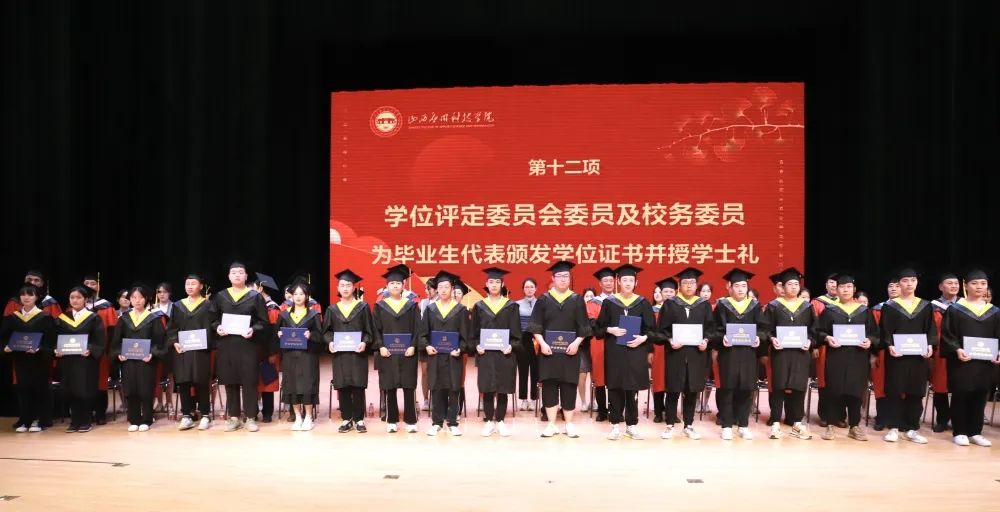 伴随着温情的音乐声,宋兴航校长与其他学位评定委员会委员为获得学士学位的毕业生一一扶正流苏、颁发学位证书,他们与毕业学子深情拥抱、握手,合影留念。