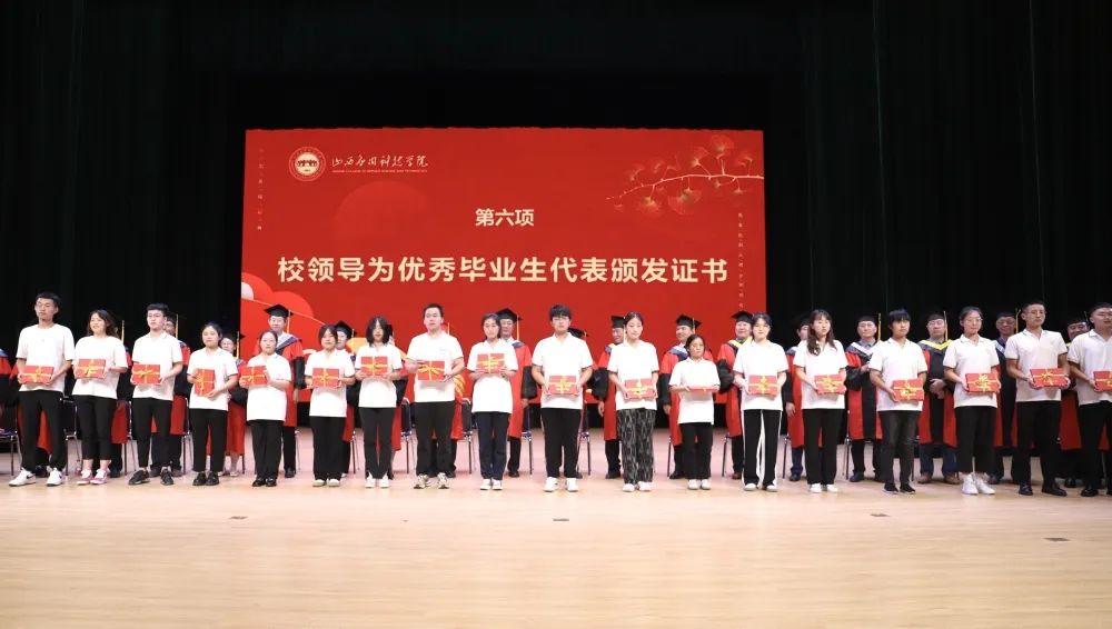 在热烈的掌声中,校领导分别为毕业生班代表颁发毕业证书,为优秀毕业生代表颁发了荣誉证书,恭喜他们为自己的大学生涯交出优秀答卷。