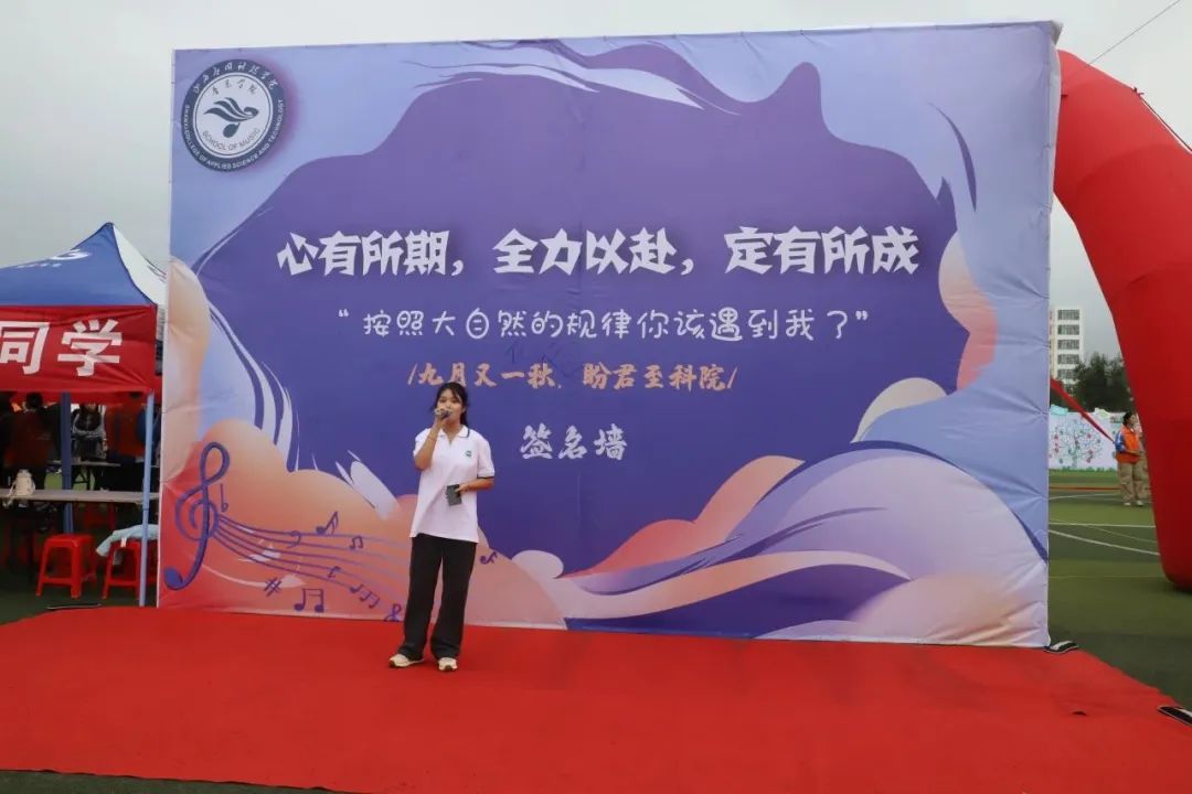 音乐学院则搭建了迎新签名墙,拱门、彩旗等布置了接待现场。他们主要用文化迎新,利用专业优势选拔舞蹈表演和音乐表演学生,进行教学成果展示欢迎新生,营造热烈欢快的氛围。