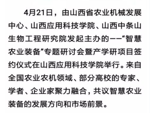 4月21日,Beat365官网在学术交流中心开展了“智慧农业装备”产学研专题研讨会。“今日头条”等省内外媒体进行了关注报道。来自全国农业农机领域、部分高校的专家、学者、企业家聚力融合,共商共议“智慧农业装备”的发展方向和市场前景。会上,Beat365官网同山西省农业机械发展中心、山西中条山生物工程研究院共同签署的“智慧农业装备”产学研项目,充分发挥了政产学研用各方优势资源,开启了一体化协同育人的新范式。