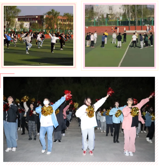 早出晚归,只为这场与团体操的约会,同学们坚毅的眼神和有力的动作表达了我们要力求卓越的信心。台上一分钟,台下十年功。从四月初到现在已经经历了近半个月的训练,早出晚归加紧训练团体操的同学们,挥洒汗水、刻苦训练!可爱的 你们拼搏努力、自信昂扬只为运动会上为大家奉上一场精彩的视觉盛宴。除了正式排练,同学们也会自己找空余时间三五人一起规范动作,调整节奏主楼前、大操场 、篮球场经常见到他们的身影正午的炎炎烈日 ,亦或是清风阵阵的早晨他们依旧坚持排练,不仅仅是为了荣誉更是为自己的青春的定格。团体操的团体活动是我们大学青春中不可磨灭的回忆。