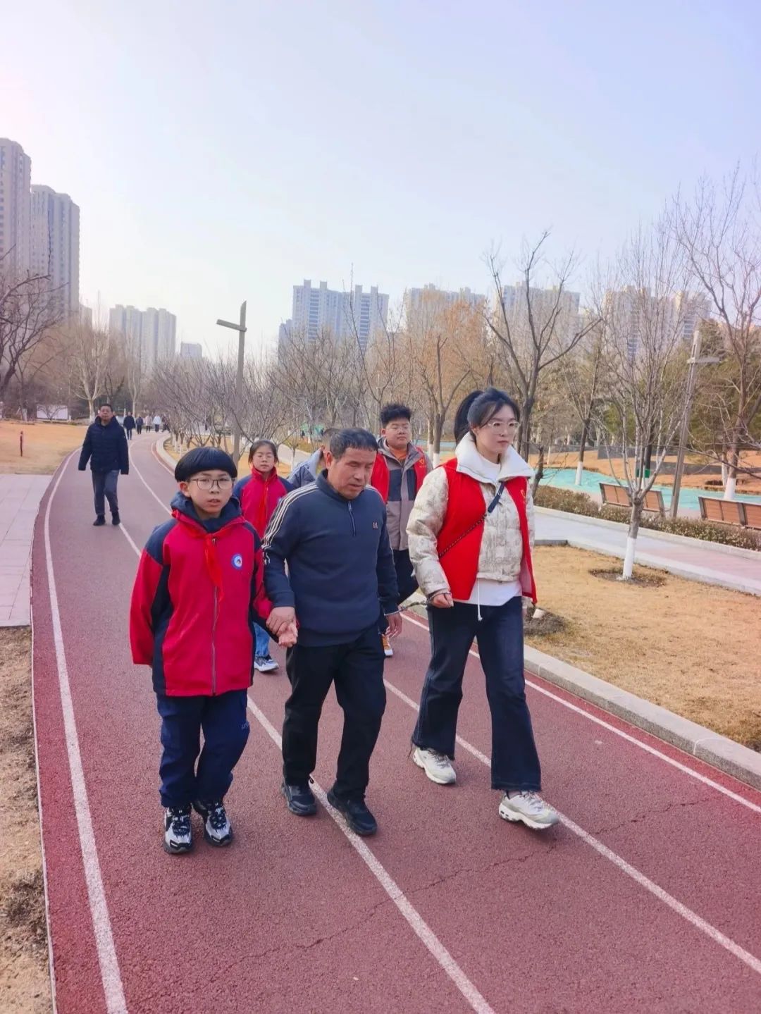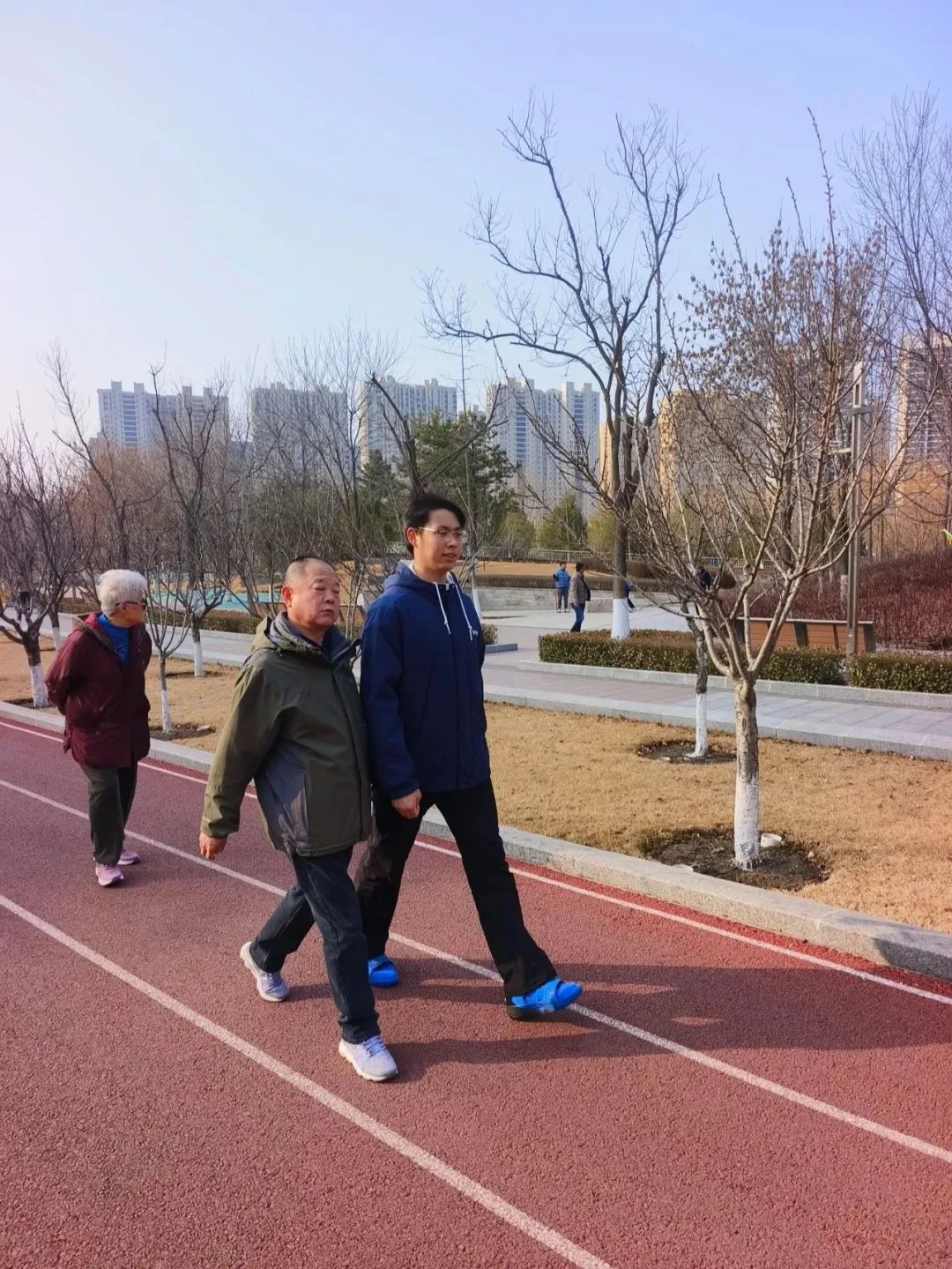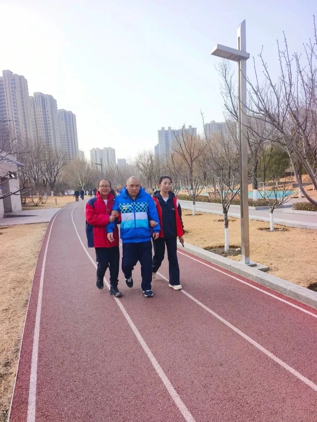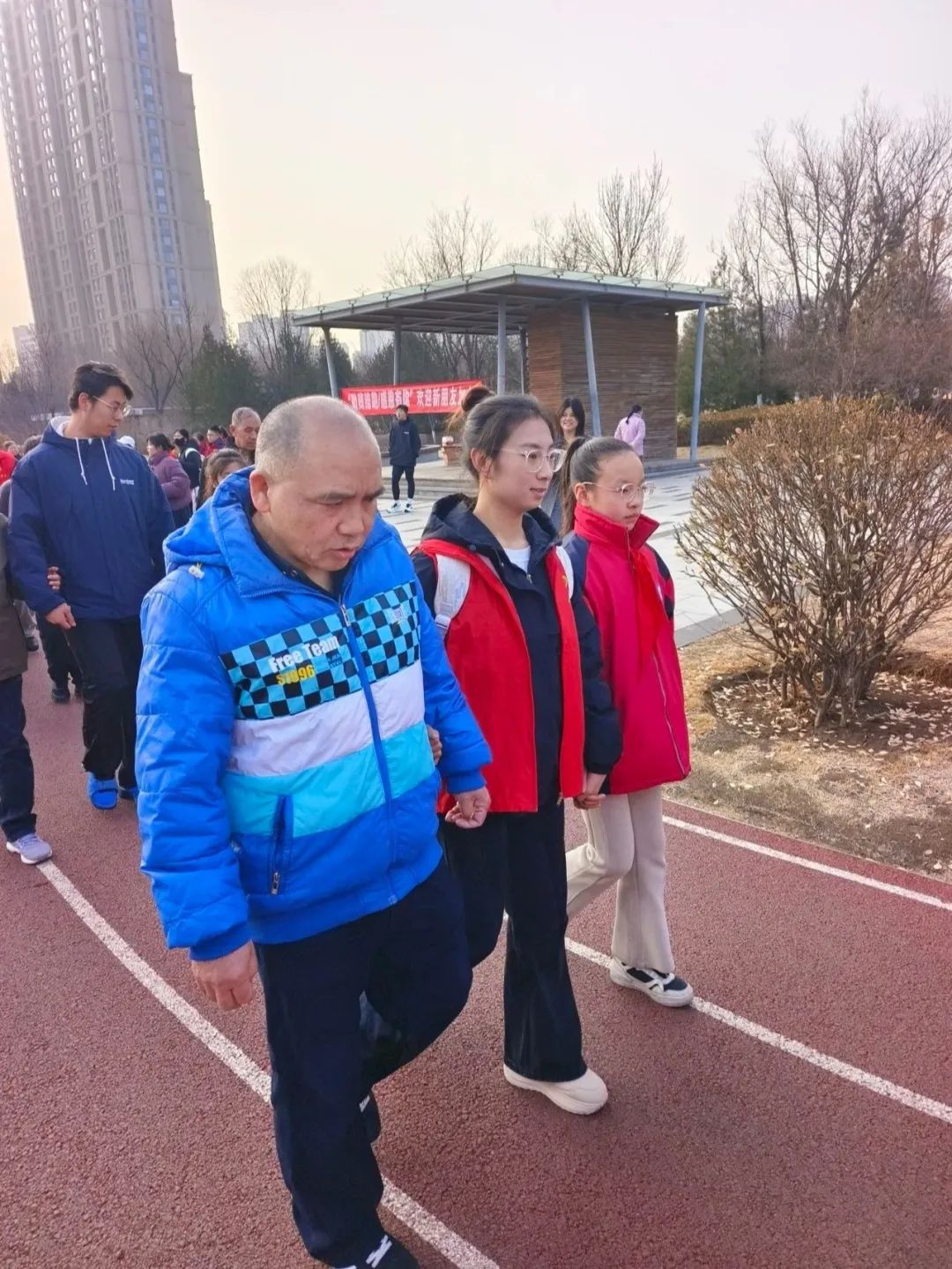 在助跑过程中,大家还分享着生活中的趣事,或是交流兴趣爱好,欢声笑语回荡在公园的跑道上。同学们还会适时地为盲人朋友加油打气:“您的状态特别好,咱们再坚持一下,马上就到下一个打卡点啦!”这一句句鼓励的话语,让盲人朋友感受到满满的力量,他们的脸上洋溢着自信的笑容,脚步也愈发坚定。