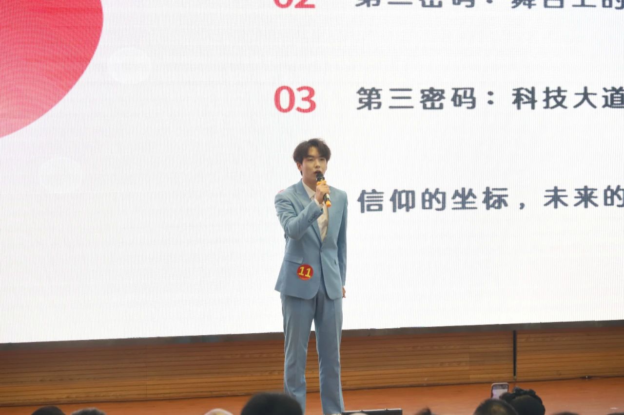 文化传媒学院的岳宇轩以三段美妙的声音密码为线索,讲述了自己在科院的成长故事。他提到,神龟湖畔的坚持、舞台上的汗水和追光、科技大道上的星辰大海,都是他科院生活中不可或缺的部分。岳宇轩的演讲富有创意和感染力,通过声音密码的形式展现了科院生活的多彩与美好。