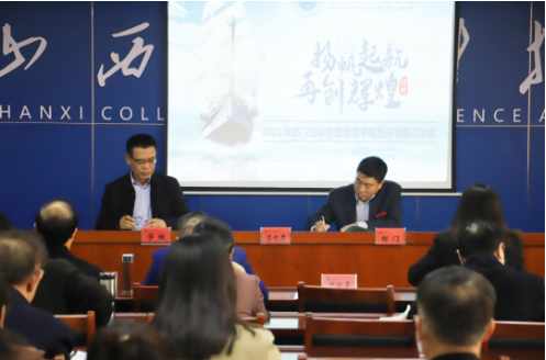 在铿锵奋进的音乐声中,校党委书记杨迎平与南校区党总支申献忠签订目标责任书,副校长原美荣与督导考核处史灵云、校团委曹荣荣、后勤保障处孔焕兰签订目标责任书,副校长柴跃生与动力与电气工程学院周全寿、实验实训中心高剑刚签订目标责任书,副校长徐秋琴与人事处张喜太签订目标责任书,副校长贺有与图书信息中心贾大前签订目标责任书,校级督学张晋斌与宣传处王瑞玉签订目标责任书。