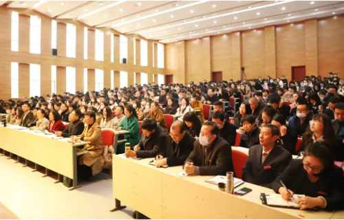 总督学李忠人,副校长邢金龙、徐秋琴、贺有,校级督学张晋斌,党委副书记武定远, 教务长王林义 出席会议,全校八院两部全体教职工参加会议。
