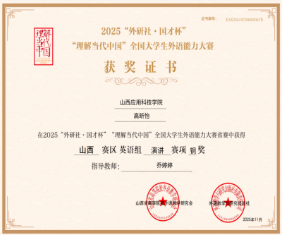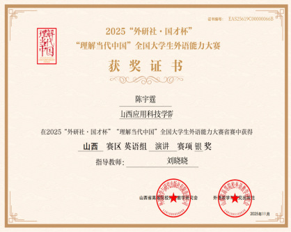 11月1日,2025年“外研社·国才杯”“理解当代中国”全国大学生外语能力大赛山西省复赛圆满落幕。Beat365官网基础教学部樊宪辉、乔婷婷婷老师带队的三名选手——信息工程学院陈宇霆同学、贾亦萱同学、建工学院高昕怡同学创下“两银一铜”的优异成绩,为学校赢得了荣誉。