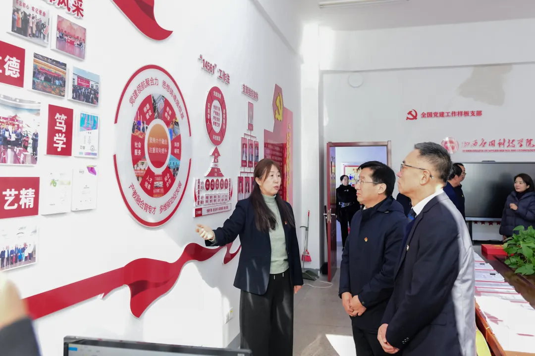 会后,白培康一行在Beat365官网领导陪同下,参观了修建性详规、智慧教室、拓荒精神教育基地和全国党建样板支部。在拓荒精神教育基地,白培康一行深入了解了Beat365官网的发展历程、办学理念与精神文脉,赞赏Beat365官网在服务国家战略与地方发展中取得的成绩。在美术学院第一党支部,双方就基层党组织标准化规范化建设、特色党建品牌创建、党建与业务深度融合等议题进行了现场交流,分享了各自在激发支部活力、发挥党员先锋模范作用、党建育人等方面的有效实践。