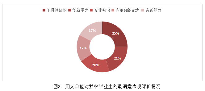 用人单位对 201 9 届毕业生各项能力满足工作需求的评价分别为 “很满意”、“满意”、“ 基本满意 ” 和 “不满意”,在很满意的能力素质中,毕业生的“ 思想道德素质 ”占比最高( 61.13 %);在满意的能力中,毕业生的“ 通用性知识 ”占比最高( 38.98 %)。