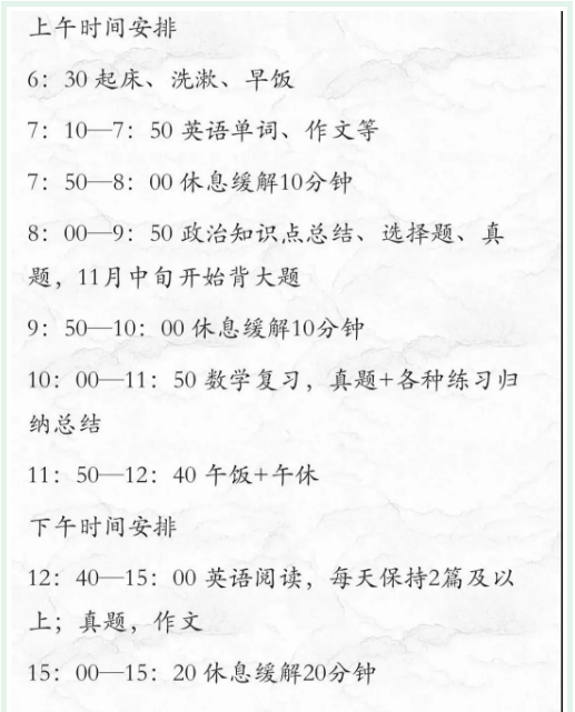 起床:这件事说起来容易做起来难。并不是要大家起早贪黑的去学习,但是,起床应该有个明确的时间规定,有计划的进行。