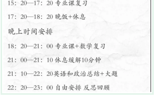 专业课:提前了解自己所考院校的往年真题,搞清楚题型分布。在答题的时候,可以按照分值对时间进行切割。答题前把卷子整个浏览一遍,在答前面的题的时候,大脑也会潜在性的为后面的问题理清思路。