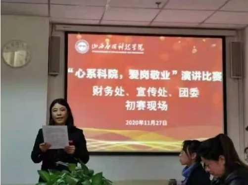11月27日下午,财务处、宣传处、团委联合开展进行了第七届“心系科院·爱岗敬业”演讲比赛初赛。党委副书记、副校长原美荣,思政部主任赵民胜,宣传部部长史志宏,督导处处长史灵云应邀担当本次初赛评委。