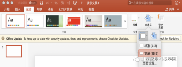 在这里也特别建议制作课件的老师将课件设置成16:9的宽屏界面,这样可以填充整个屏幕,不会出现黑边,学生观感更加。具体操作方法以office2016为例(图2),“设计-自定义-宽屏(16:9)”。