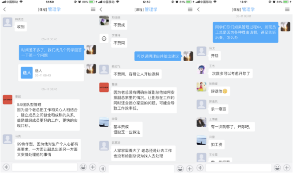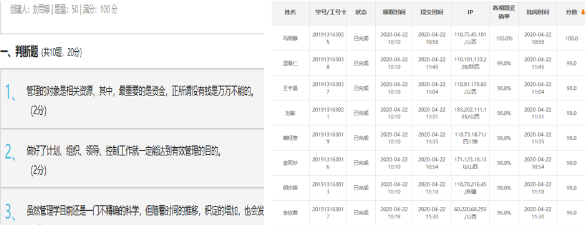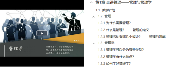 本课程在每一章均采用“以小故事或案例导入开篇——以问题为导呈现章节内容——以案例分析阐释主要理论——以随堂测验巩固基础知识——以问题讨论深化重点内容——以延展阅读拓展相关知识”的模式,通过“走进管理、以史为鉴、多谋善断、纲举目张、纵横有序、知人善用、水无常形、兵随将转、士气高昂、水到渠成、防微杜渐、活力之源”等模块,将抽象的管理理论形象化、趣味化、现实化。 虽然疫情一定程度上影响了教学的顺利展开,但是线上教学的质量丝毫不能受到影响,秉着对学生认真负责的态度,克服困难,一课一案,保证线上教学质量。同时丰富的文字视频资源为教师的备课提供辅助,上传至教学平台分享给学生成为预习和自主性学习的基础。